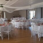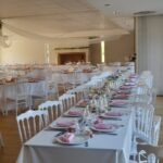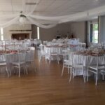 Peuvent être mises à disposition : 20 tables rondes Ø 180 cm, 14 tables rectangulaires 200*70 cm. 200 chaises et une capacité en couverts pour 200 personnes. Au-delà de 200 personnes des ajouts pourront être faits suivant les disponibilités de la commune.