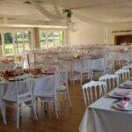 Les dimensions de la salle de réception sont de 19.8 m sur 12.3 m, hauteur sous plafond 2.80 m soit 243 m² auxquels il faut retirer les 2 m² de la cheminée décorative. L’extension mesure 12.6 m de large et 9.9 m de profondeur hauteur sous plafond : 3.50 m soit 124 m².
